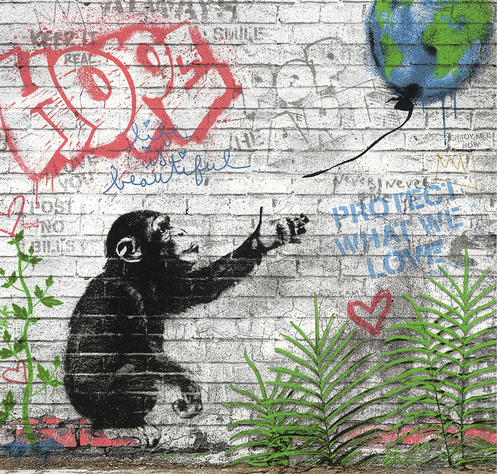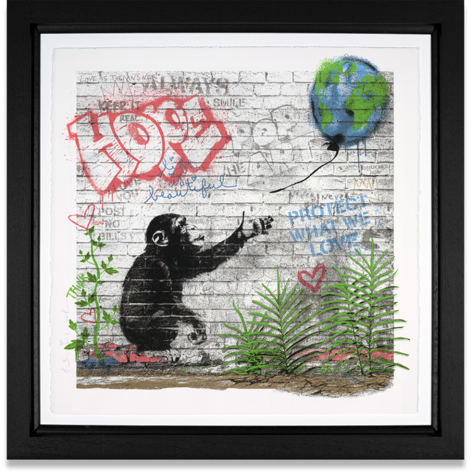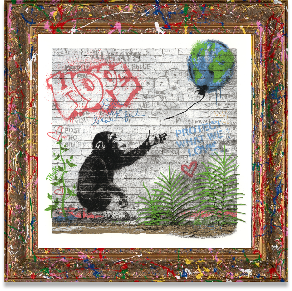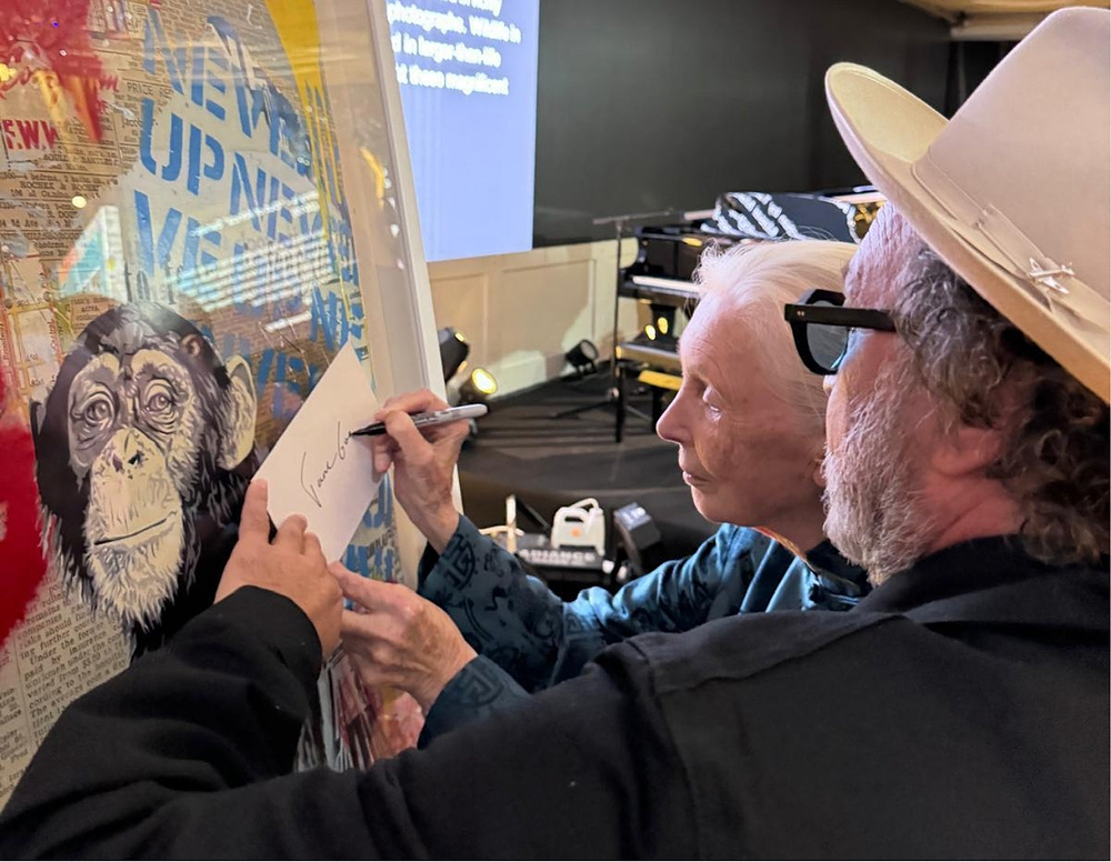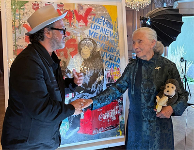 Mr Brainwash and Jane Goodall formed an immediate connection the first time they met. Inspired by her dedication, he created a series of works that feature her words and ideas, written in her own hand. Through colour, humour and optimism, his art celebrates the message that defines her life’s work: protect what we love.