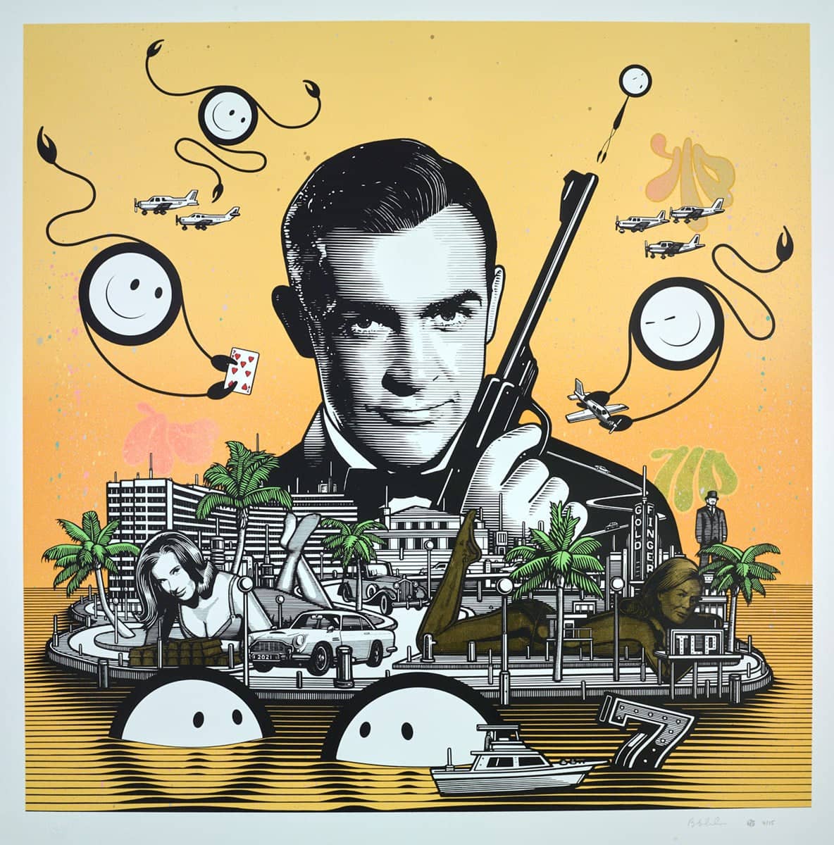 Enter the iconic world of James Bond 007 with this limited edition piece by The London Police. "007 At Sea 4/15" is a timeless masterpiece, featuring a blend of contemporary styles in black, gold, green, orange, and white. Meticulously crafted to a size of 92 x 37 inches, this spectacular artwork exudes sophistication and exclusivity. Make it the centerpiece of your home.