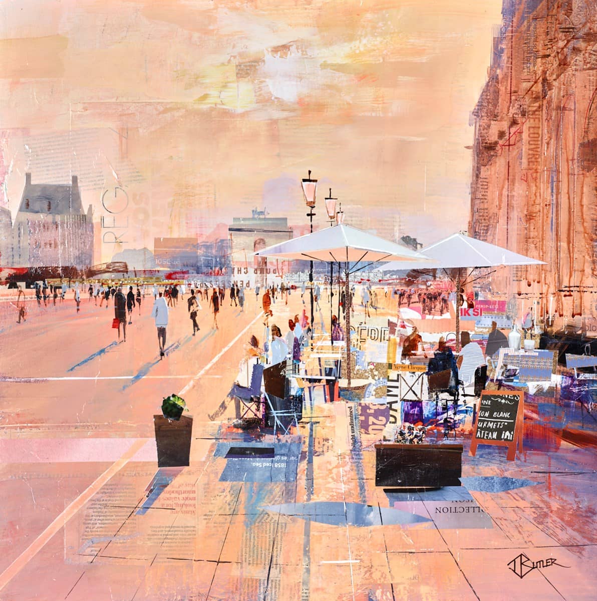 Butler's collages are composed of a wide range of materials, including vintage paper ephemera, old postcards, maps, stamps, and other found objects. He cuts, tears, and layers these materials to create intricate compositions that often depict urban landscapes and cityscapes.