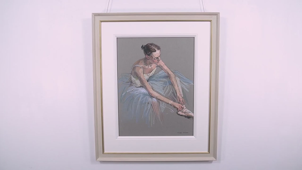 Readying (19" x 25") by Valeriy Gridnev captures a moment of quiet concentration as a ballerina prepares for her performance. Seated in a graceful pose, she bends forward to adjust the ribbons on her ballet shoes, her body language exuding a sense of calm focus. The soft tones of her tutu and the gentle lines of her limbs are rendered with expressive fluidity, evoking the delicate balance between physical rigour and ethereal poise.